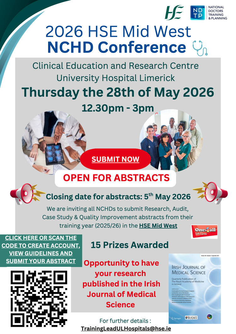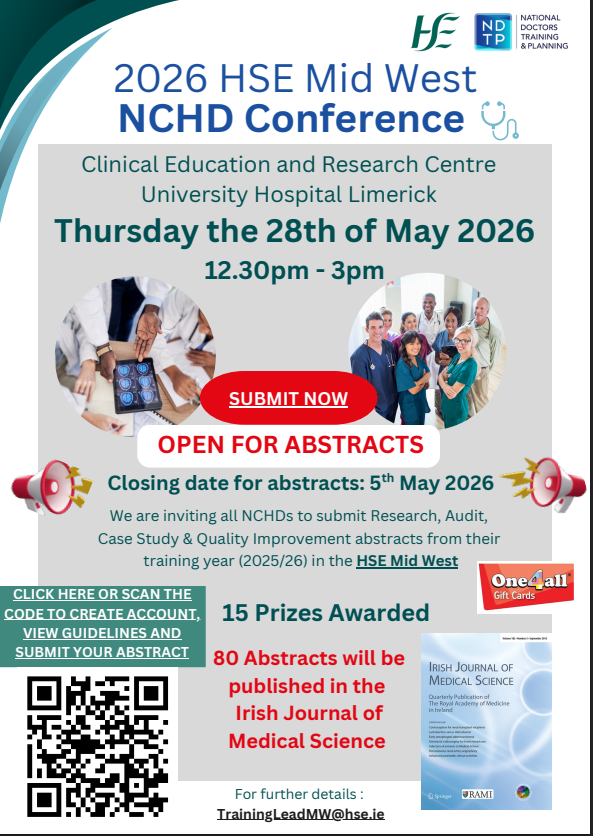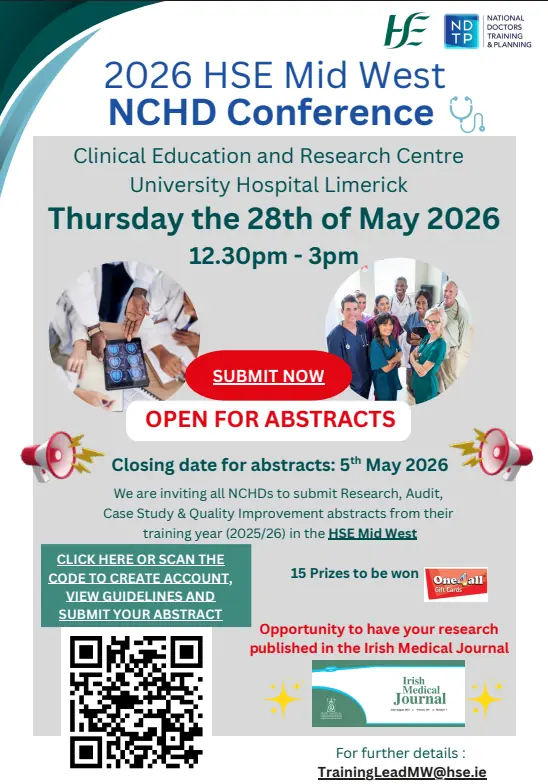 02/03/2026. 2026 HSE Mid West NCHD Conference Open for Abstracts until 5/5/2026. Opportunity to be published in the Irish Medical Journal and 16 prizes to be won. Please click in the link to create your account and submit the abstracts: https://nchd2026.exordo.com/login